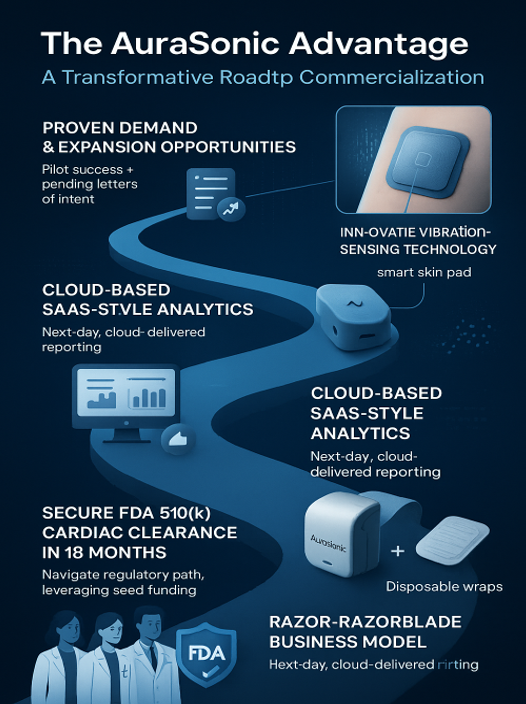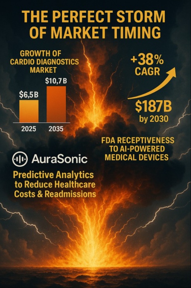 • Cardio diagnostics is expanding fast. The global cardiovascular diagnostics market is forecast to grow from $6.5B (2025) to ~$10.7B by 2035—a clear, rising beachhead for AuraSonic.